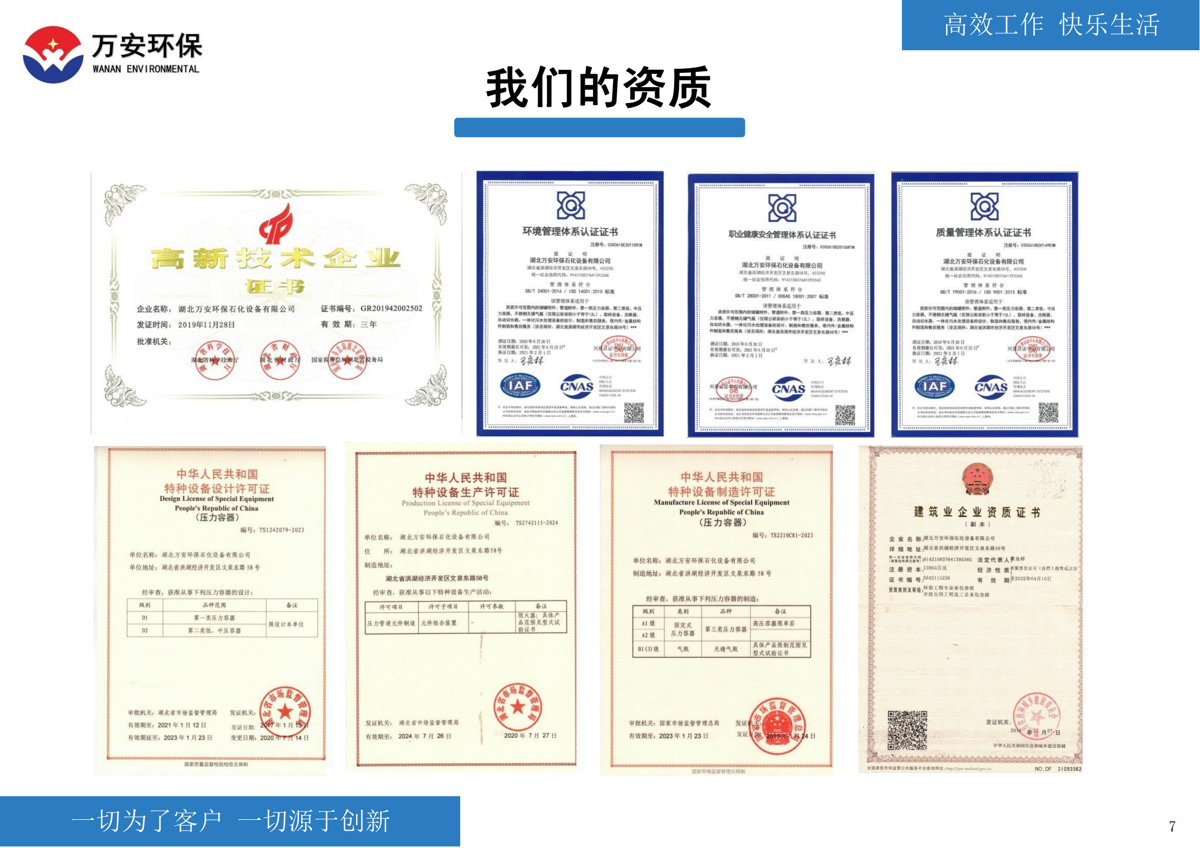 湖北万安公司是集产、学、研于一体的创新型高新技术企业,通过了ISO9001质量管理体系认证,ISO14001环境管理体系认证,OHSAS18001职业健康安全管理体系认证,获得了安全生产标准化证书。集团公司拥有多项发明、实用新型、软件著作权。