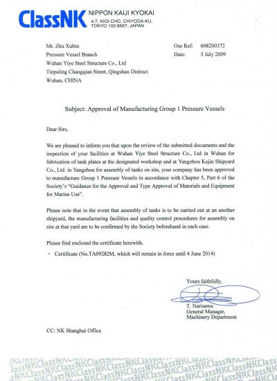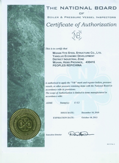 2010年12月18日,武汉一冶钢结构有限责任公司又收到了从美国俄亥俄州寄来的NB证书及印章,这表明,一冶钢构公司自成功取得美国机械工程师协会(ASME,读作阿斯米)认证后,又成功取得了美国国家锅炉压力容器检验师协会(NBBI)认证。按照该认证的许可,在一冶钢构公司根据ASME规范生产的U及U2钢印产品上,可以再敲上美国国家锅炉压力容器检验师协会的NB钢印。
