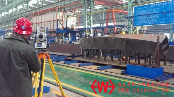 该批弯扭箱型柱翼、腹板为非等距扭曲,具有火工弯曲成形难控制, 四条纵边控制点拟合难度大,焊接变形大等难点。为保证构件顺利加工制造,武汉厂在制造前多次组织图纸会审技术攻关工作,确定利用单板弯曲胎架,辅以火攻变形的方法,完成板件的弯曲成型的工艺,并编制《工艺作业指导书》并对作业班组、QC人员进行详细技术交底。该弯扭构件的装配、焊接等全部工序均在总装胎架上完成,全程使用经纬仪、全站仪辅助调节定位。同时,专业技术质检人员全程跟踪指导,严格把关。