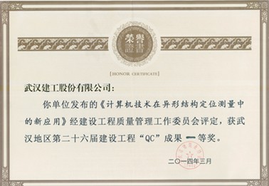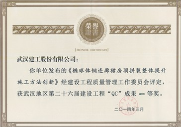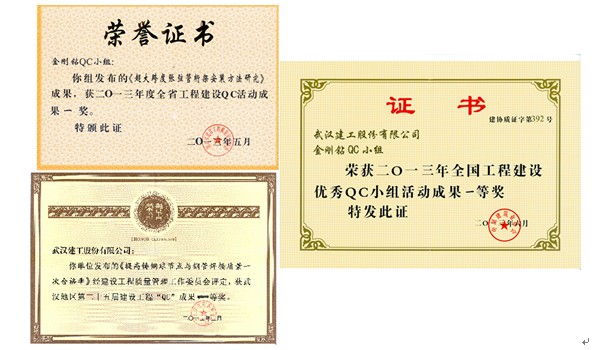 武汉建工股份有限公司金刚钻QC小组多次展开QC活动,不断提高工程施工质量水平,在武汉市、湖北省、全国QC成果发布中一贯保持一等奖的佳绩。