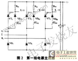 第一组电源主回路由三个晶闸管模块组成整流桥如图2,其中VT?1和VD?1为一模块,输出端(L+,L-)接滤波电容C和放电电阻R。每相波头信号X2(1,3,16)送控制回路,经处理得相应晶闸管的门极触发信号X2(9,13,11)。