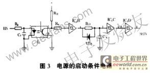 电源的启动条件电路如图3。当控制器发来EIN(启动)信号,光耦I1的1端呈低电位,经施密特非门驱动器IC1B的3,4脚反相为高电位,通过R13给C9充电,消除信号抖动,再经IC1C、IC1D两次反相仍为高电位,分别为三相触发电路和输出正常电路提供开门信号SEIN。