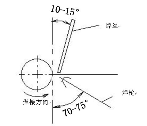 焊接时要严格控制钨极、喷嘴与熔池的位置,即焊枪钨极应垂直于管子轴线,喷嘴至两管的距离要相等,焊丝与通过熔池的切线成10-15°,送入熔池,焊枪角度,焊丝角度见图2